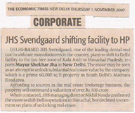 DELHI-BASED JHS Svendgaard. One of the leading dental and oral healthcare manufacturers in the country. Plans to shift its Delhi facility to the tax-free zone of Kala Amb in Himachal Pradesh, reports Mayur Shekhar Jha in New Delhi. The move may be seen as an attempt to unlock substantial real-estate value by the company which is prime 60,000 sq ft property in South Delhi’s Mathura Road area. According to source in the real estate brokerage business the property will command a valuation of over Rs 300 crore. When contacted, JHS managing director Nikhil Nanda confirmed the move to shift Delhi operations to Himachal, but declined to comment on plans of unlocking real estate.